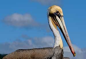 An amazing recovery! Brown pelicans were listed as endangered in 1970 after populations plummeted due in large part to use of the pesticide DDT. Populations have since recovered and brown pelicans were removed from the endangered and threatened species list in 2009.