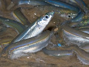 Fish out of water! Grunion have a unique mating behavior of spawning on sandy beaches in southern California at very high tides, out of water. Females swim as far up on the beach as possible and dig a hole in the sand by wiggling their tails back and forth, and release their eggs. Males follow and fertilize the eggs. The eggs then remain buried in the sand until they hatch during the next tide that is high enough to reach them, usually 10 or more days later!
