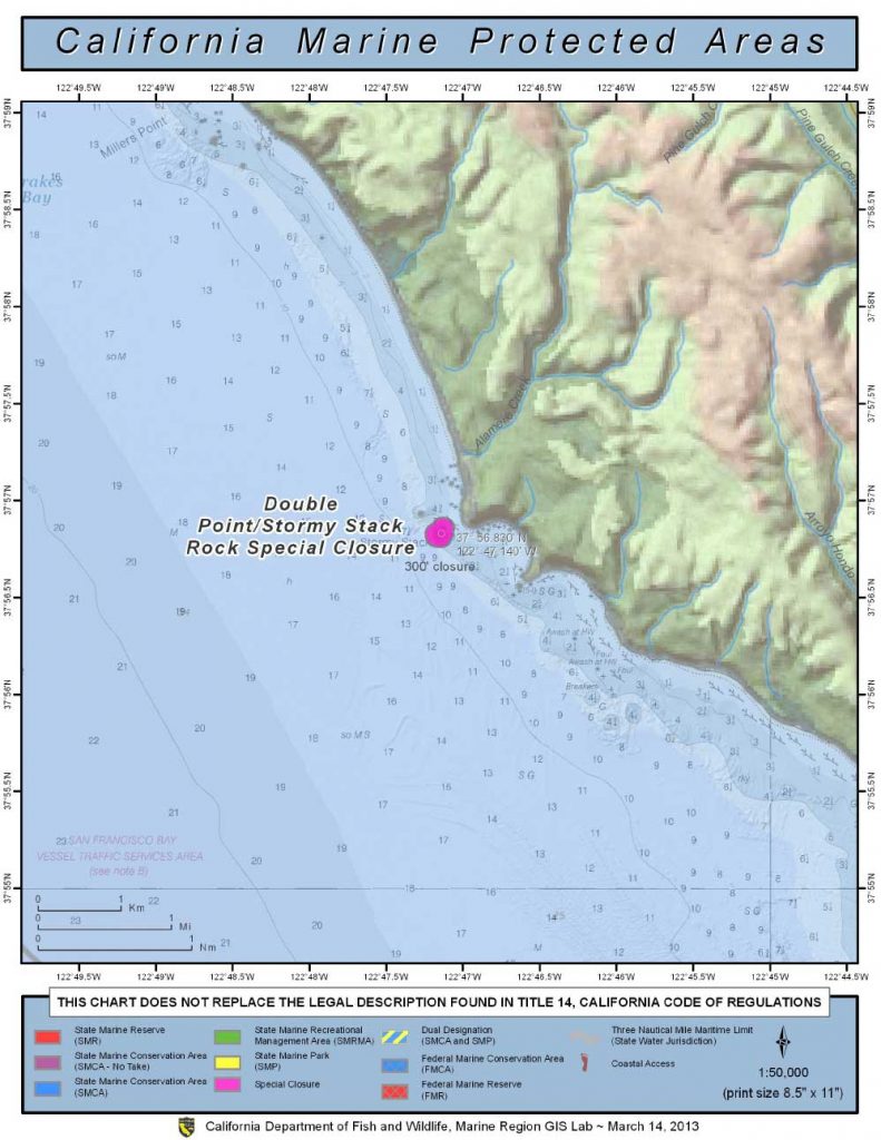 From the mean lower low tide line to a distance of 300 feet seaward of any shoreline of Stormy Stack Rock, located in the vicinity of 37° 56.83′ N. lat. 122° 47.14′ W. long.