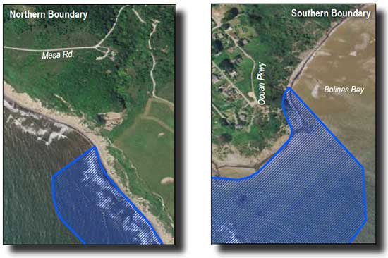 This area is bounded by the mean high tide line, a distance of 1000 feet seaward of mean lower low water, and the following points: