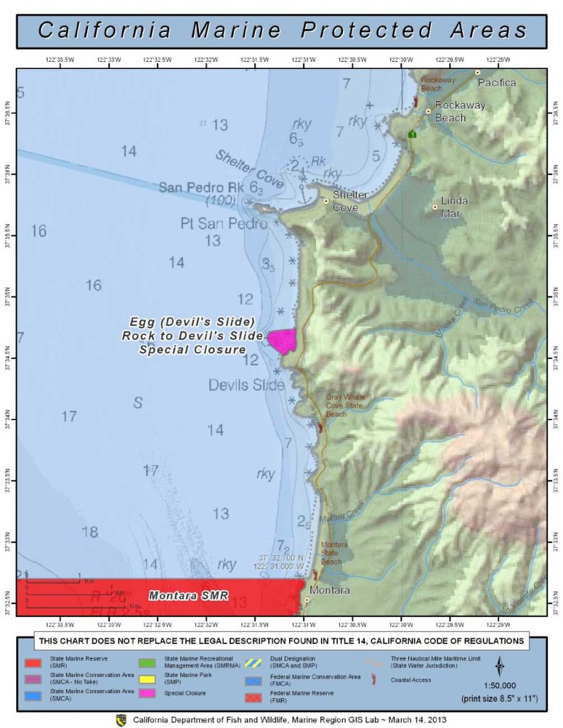 From the mean high tide line to a distance of 300 feet seaward of the mean lower low tide line of any shoreline of any of the three rocks comprising Egg (Devil’s Slide) Rock, located in the vicinity of