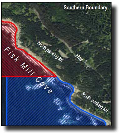 This area is bounded by the mean high tide line and straight lines connecting the following points in the order listed except where noted: