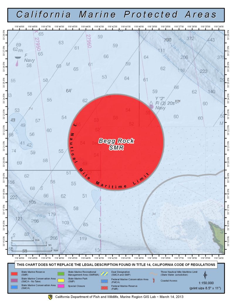 This area includes all state waters below the mean high tide line surrounding Begg Rock, located in the vicinity of 33° 21.71′ N. lat. 119° 41.76′ W. long.