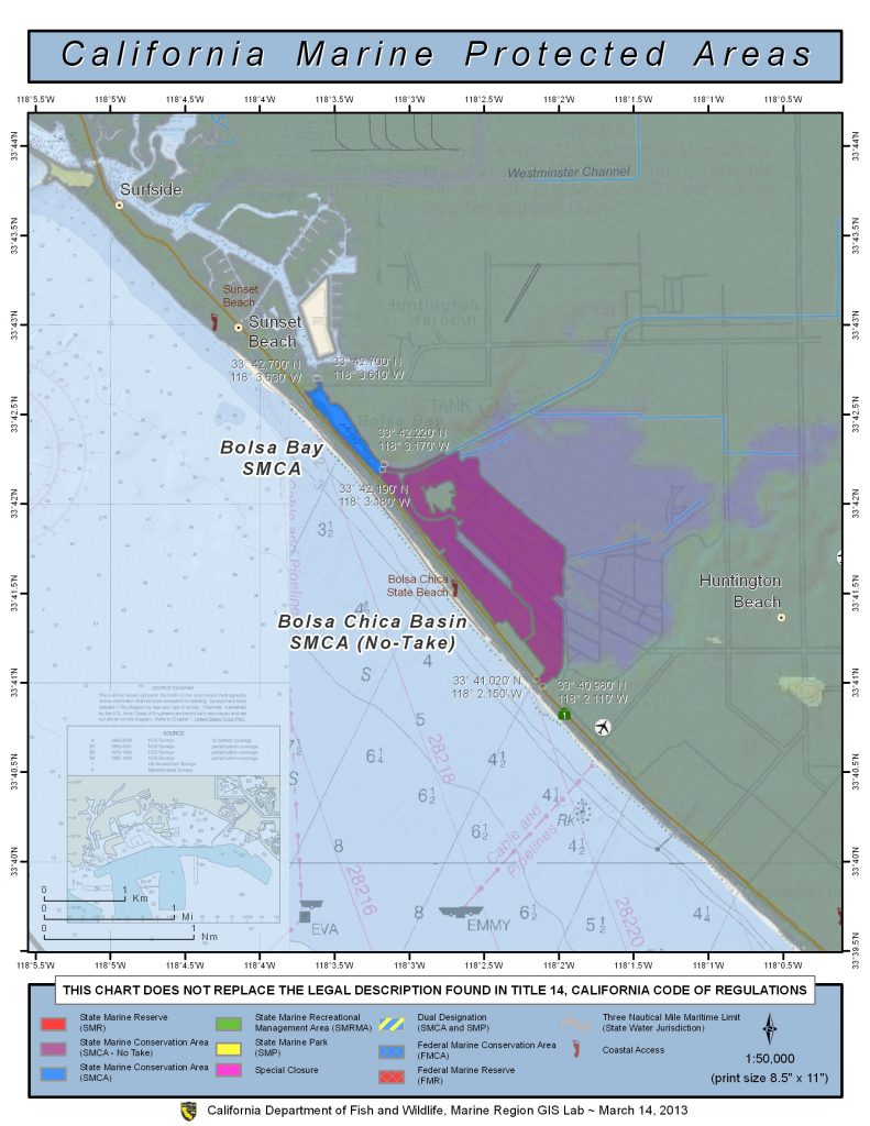 This area includes the waters below the mean high tide line within the Bolsa Chica Basin estuary northeastward of the Pacific Coast Highway Bridge, approximated by a straight line between the following two points: