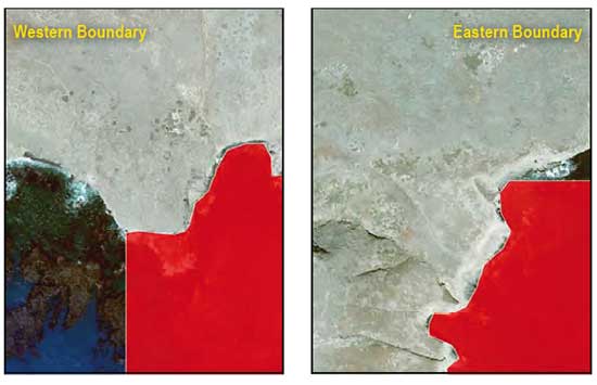 This area is bounded by the mean high tide line and straight lines connecting the following points in the order listed except where noted: