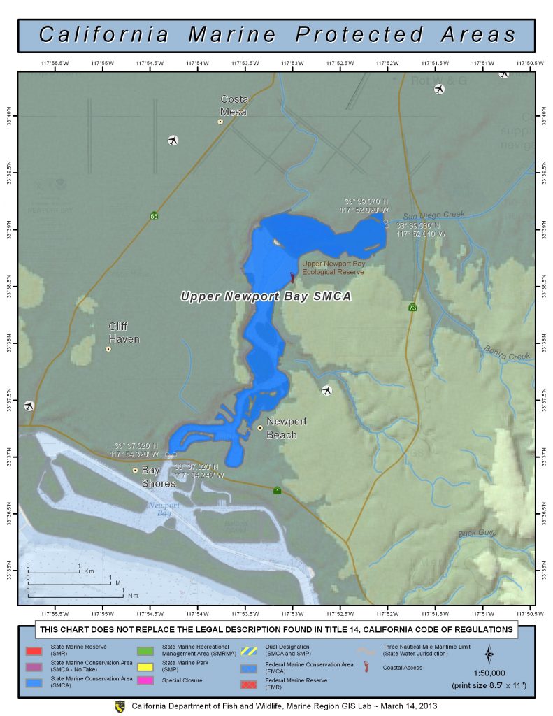- In waters below the mean high tide line inside the Upper Newport Bay Ecological Reserve, northeastward of a line connecting Shellmaker Island (33° 37.20′ N. lat. 117° 53.51′ W. long.) and North Star Beach (33° 37.38′ N. lat. 117° 53.60′ W. long.) the following restrictions apply: