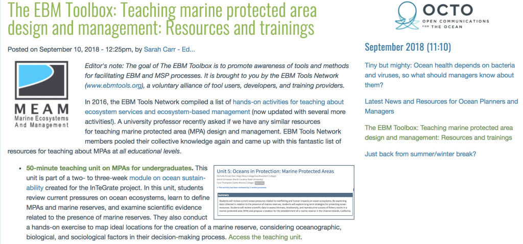 This module introduces MPAs including the costs and benefits, relations to biodiversity and fisheries management, design and implementation, with a look towards how MPAs can be more effective in the future. Through role-playing, the accompanying exercise allows students to experience the challenges of developing a plan for an MPA that satisfies different users while meeting common objectives.